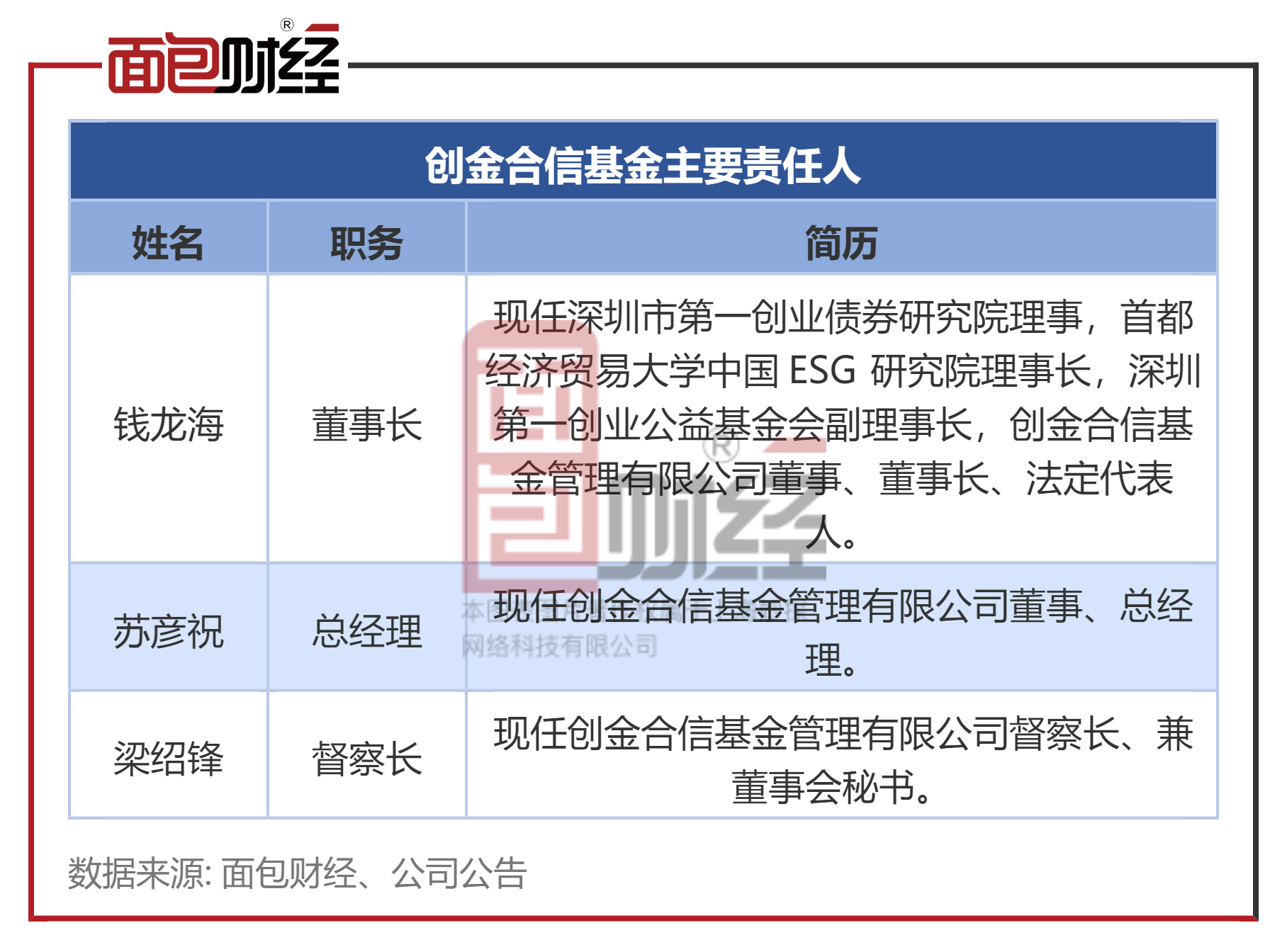 创金合信基金的董事长为钱龙海、总经理为苏彦祝、督察长为梁绍锋。