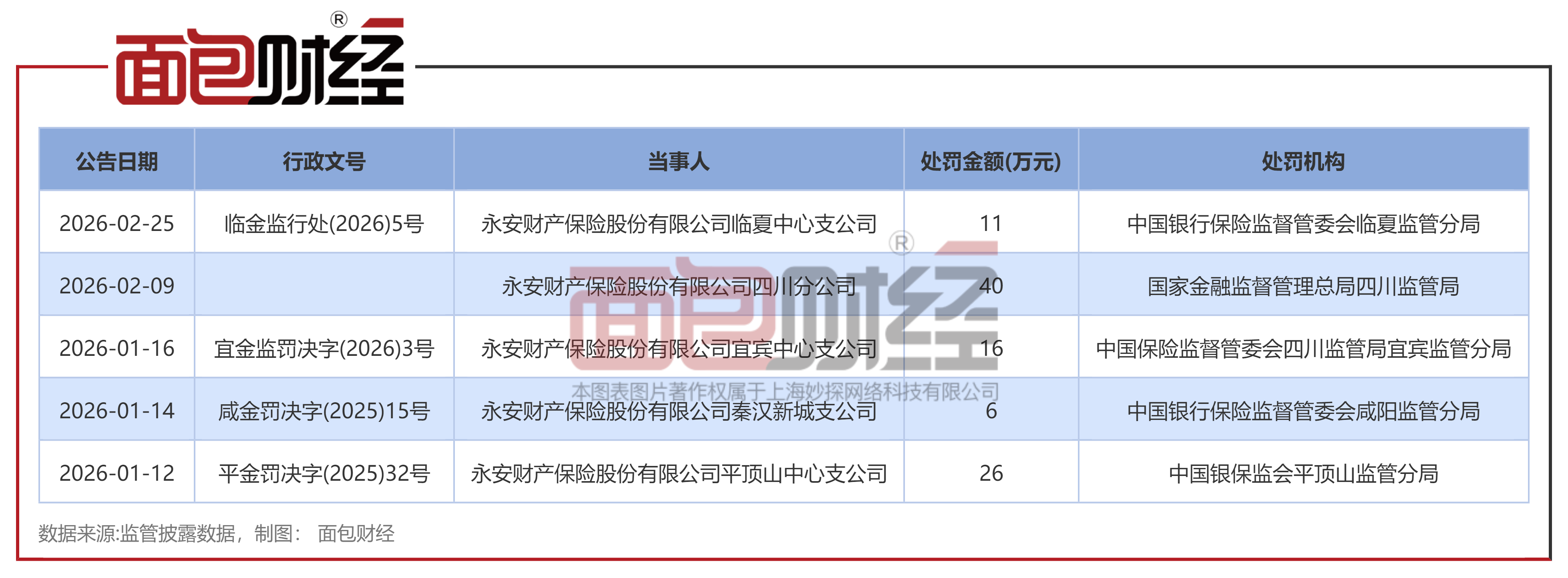 永安财险:因业务违规被罚11万元,2026年以来累计罚没金额达99万元