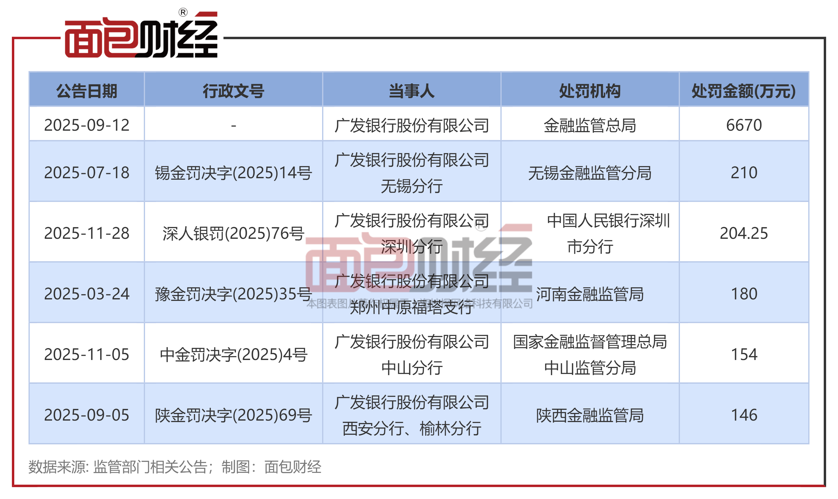 2025年9月12日,广发银行股份有限公司因相关贷款、票据、保理等业务管理不审慎,监管数据报送不合规等,被金融监管总局罚款6670万元。其相关责任人李工凡、陈卉被警告并罚款合计10万元。