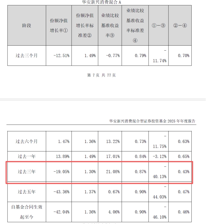 以华安新兴消费A为例,这只成立于2020年的偏股混合型基金,截至2026年4月20日收益率为-42.27%,跑输业绩比较基准超过45个百分点,同类排名1318/1366,投资者亏损惨重。该产品首任基金经理为陈媛,2023 年华安基金增聘裘倩倩、李杨共同管理该产品。