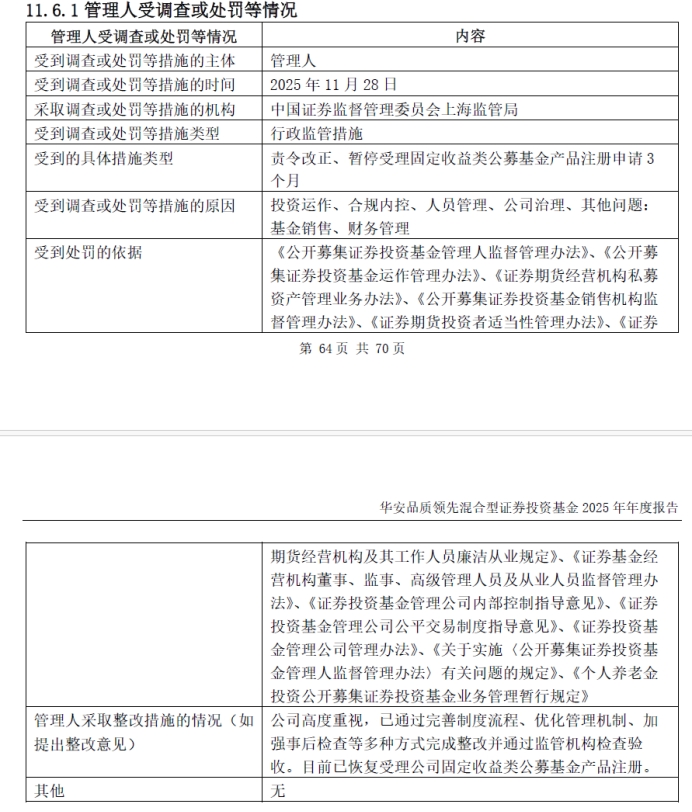 2025年11月28日,华安基金被中国证监会上海监管局责令改正、暂停受理固定收益类公募基金产品注册申请3个月。其违规问题涉及投资运作、合规内控、人员管理、公司治理、基金销售及财务管理等多个环节。