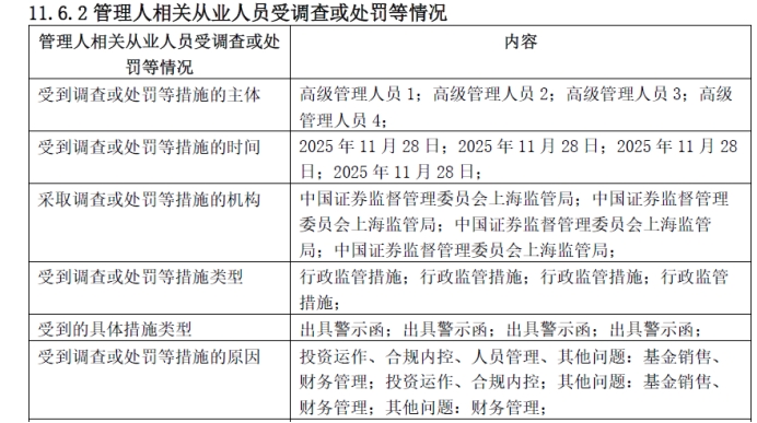 据近期公告披露,2025年11月,华安基金被中国证监会上海监管局处罚,其违规问题涉及投资运作、合规内控、人员管理、公司治理、基金销售及财务管理等多个环节,4名高级管理人员也被出具警示函。