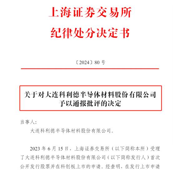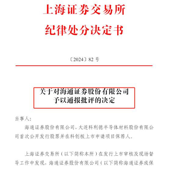 近日,上交所发布公告表示,因对大连科利德半导体材料股份有限公司(以下简称“科利德”)保荐核查工作履职尽责不到位等,上交所对海通证券予以通报批评。