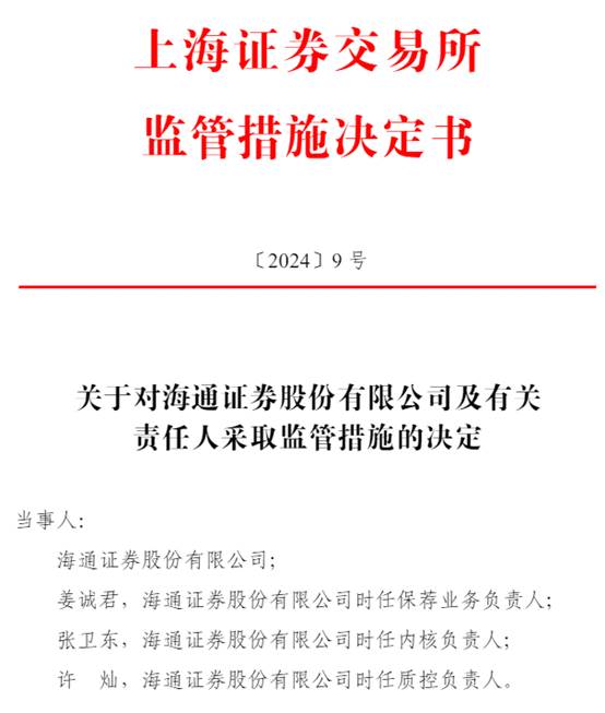 上交所决定对海通证券有限公司予以通报批评。同时,上交所要求海通证券提交经主要负责人、保荐业务负责人、质控负责人、内核负责人签字,并加盖公司公章的书面自查整改报告。