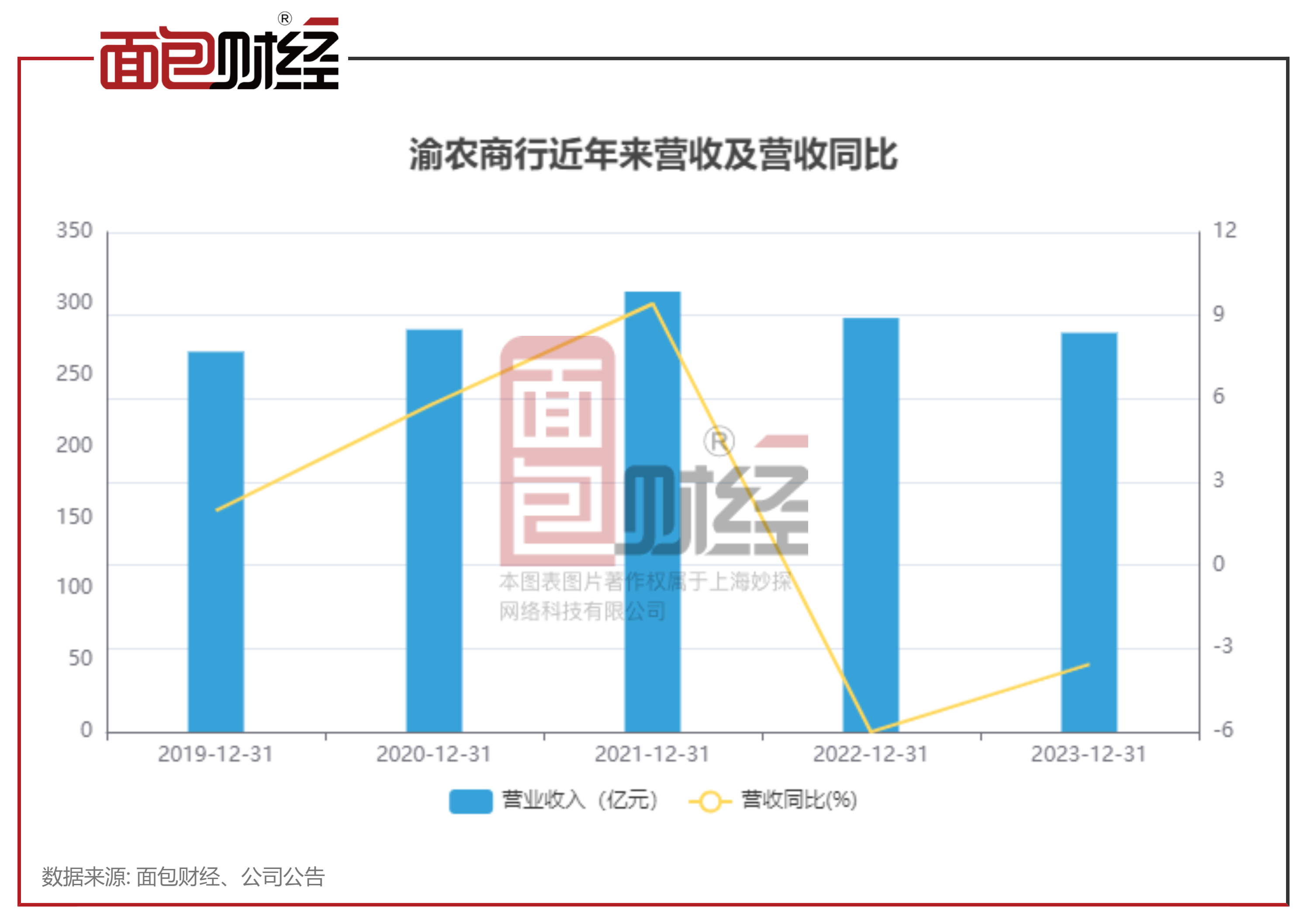 值得关注的是,该行已经连续两年营收同比下降。数据显示,2022年及2023年,渝农商行的营收分别同比下降6%及3.57%。