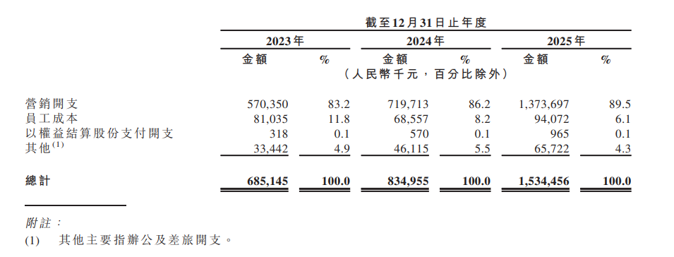 导致小阔科技经营利润增长较慢的一个重要原因是销售费用支出较大。数据显示,小阔科技2023年至2025年销售及分销开支分别达到6.85亿元,8.35亿元和15.34亿元,2025年销售及分销开支占收入的比例超过60%。小阔科技的销售及分销开支主要是营销开支。对比来看,公司2025年研发开支仅约0.19亿元,占收入比例不足1%。