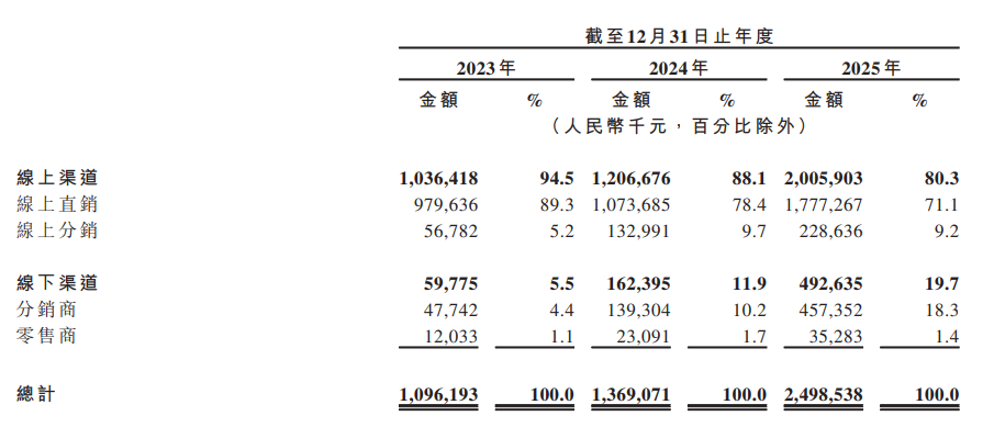小阔科技较为依赖线上渠道,2023年至2025年,公司来自线上渠道的销售占比虽呈下降趋势,但占比仍超过80%。公司的线上销售渠道包括线上直销(通过在电商平台上的自营店)及线上分销(通过主要电商平台及其他线上分销商)。