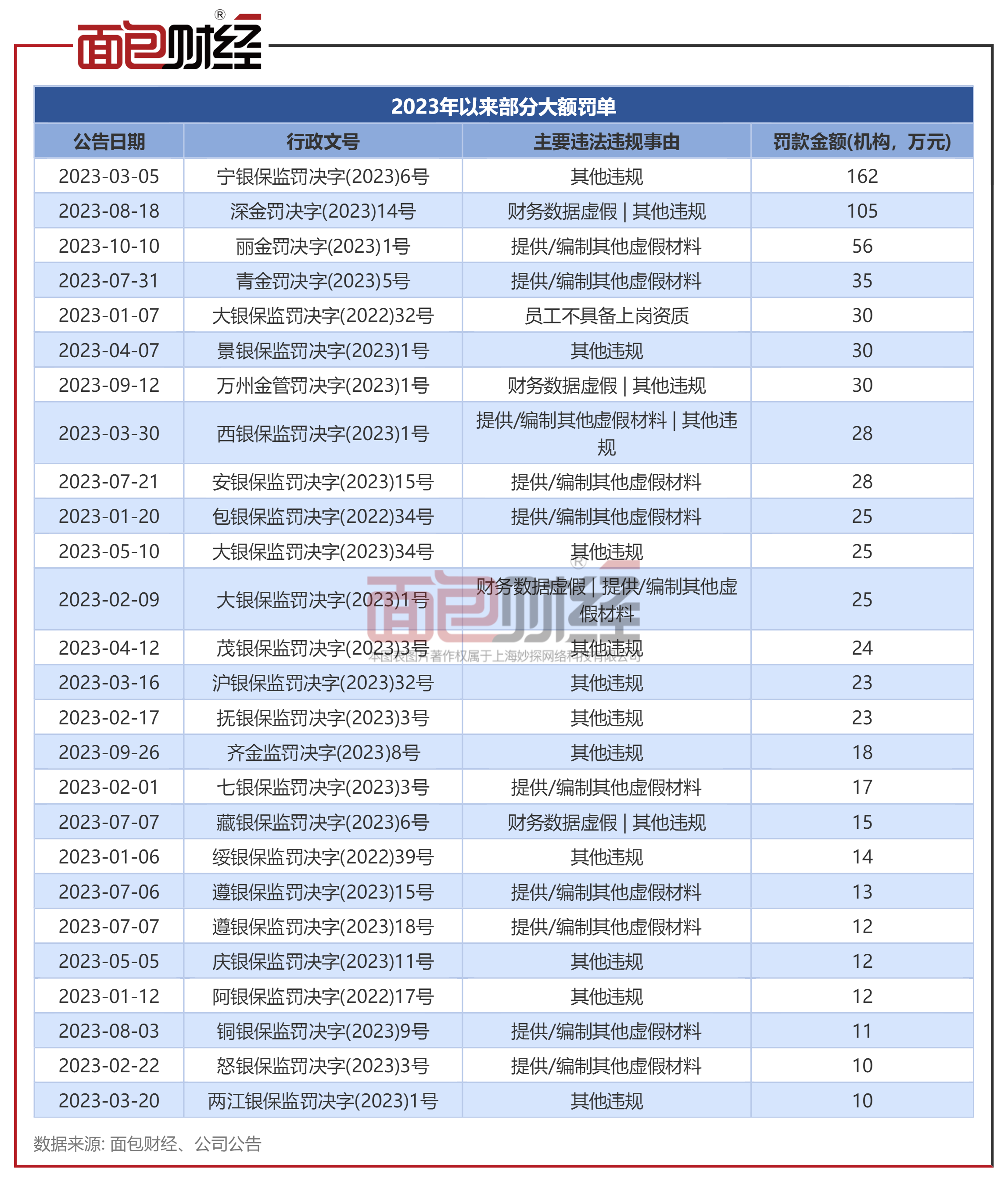面包财经对原银保监会、国家金融监督管理总局及其分支机构披露的行政处罚进行整理发现,2023年(以公告披露日计,下同)以来,太平洋财险下属机构多次被监管部门处罚,被罚款总金额超800万元。