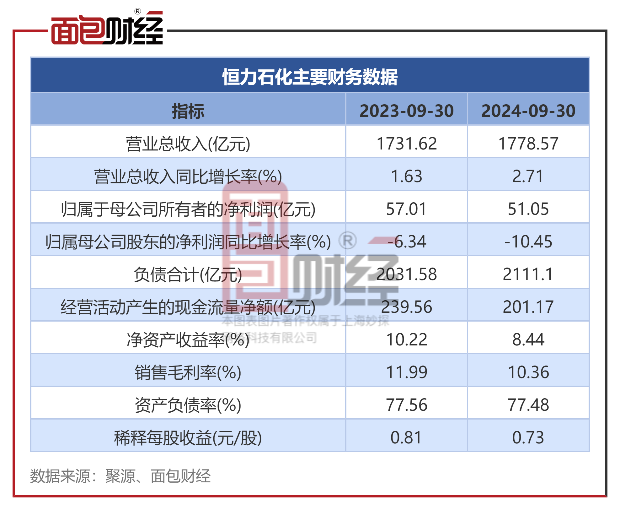2024年前三季度,恒力石化营业总收入为1778.57亿元,同比上升2.71%;归母净利润为51.05亿元,同比下降10.45%;扣非后归母净利润为46.27亿元,同比下降7.04%。