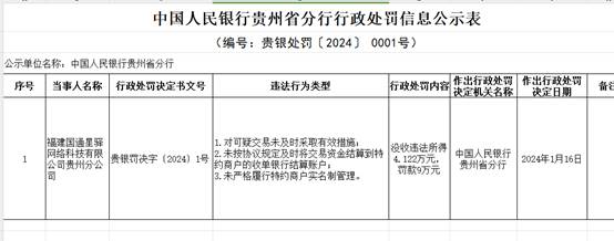 1月16日,根据中国人民银行贵州省分公布的行政处罚信息,因对可疑交易未及时采取有效措施、未按协议规定及时将交易资金结算到特约商户的收单银行结算账户以及未严格履行特约商户实名制管理,福建国通星驿网络科技有限公司贵州分公司被中国人民银行贵州省分行没收违法所得4.122万元,罚款9万元