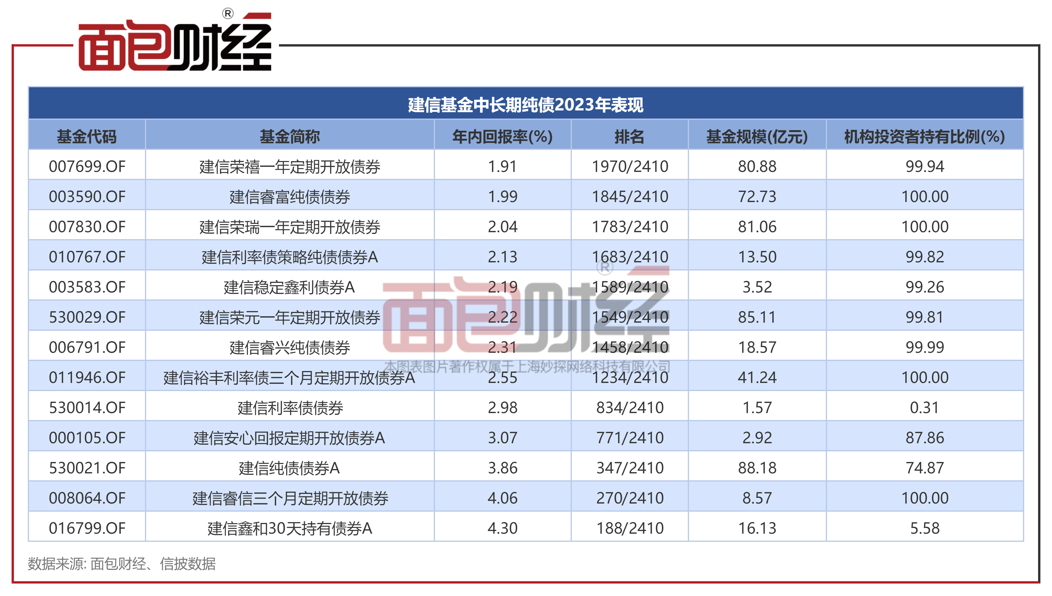 年内收益率低于2%的中长期纯债基金共有2只,分别为建信荣禧一年定期开放债券、建信睿富纯债债券。