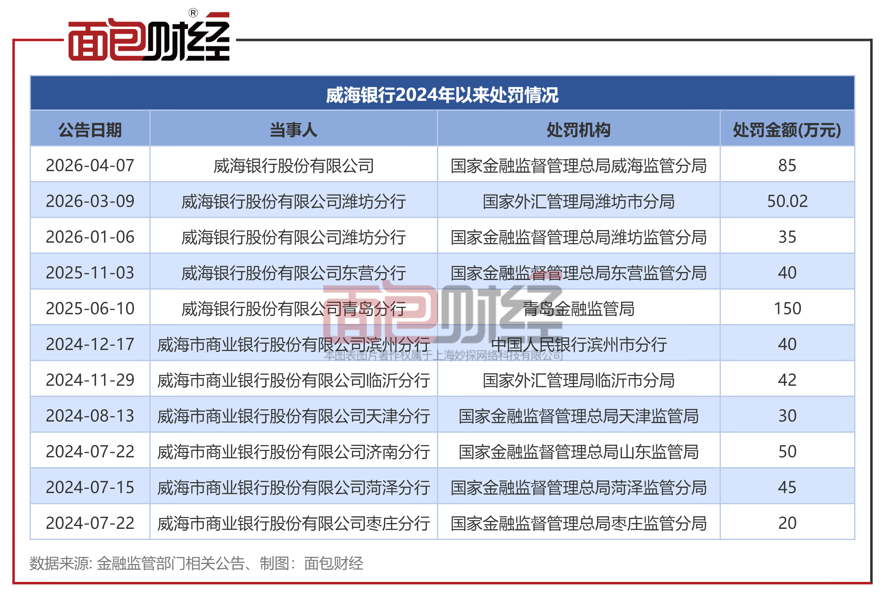 2026年1月6日,威海银行潍坊分行因违规发放无实际用途贷款、虚增存贷款规模被罚35万元;2025年6月,威海银行青岛分行由于大额客户授信管理严重不审慎,未按照项目实际进度发放贷款等多项违规,被罚款150万元,时任原威海市商业银行青岛分行行长赵晓博被给予警告。
