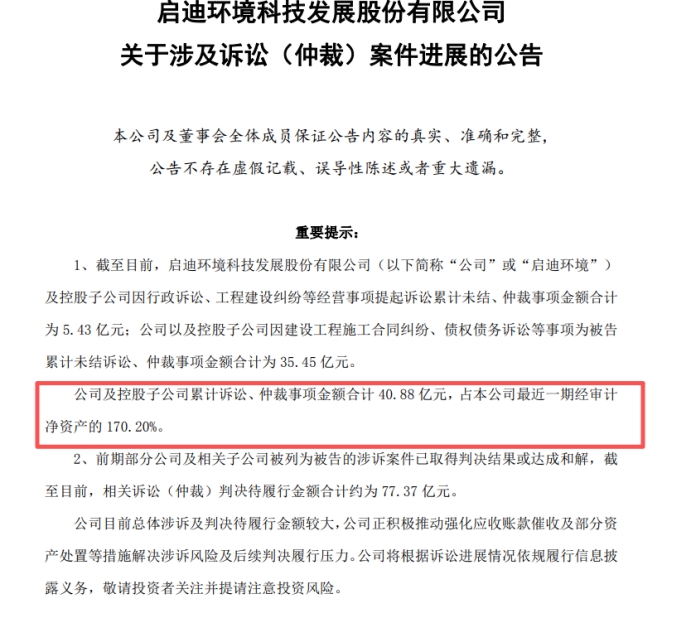 3月12日晚间,启迪环境发布《关于涉及诉讼(仲裁)案件进展的公告》。公告显示,截至目前,公司及控股子公司累计诉讼、仲裁事项金额合计40.88亿元,占公司最近一期经审计净资产的170.20%。