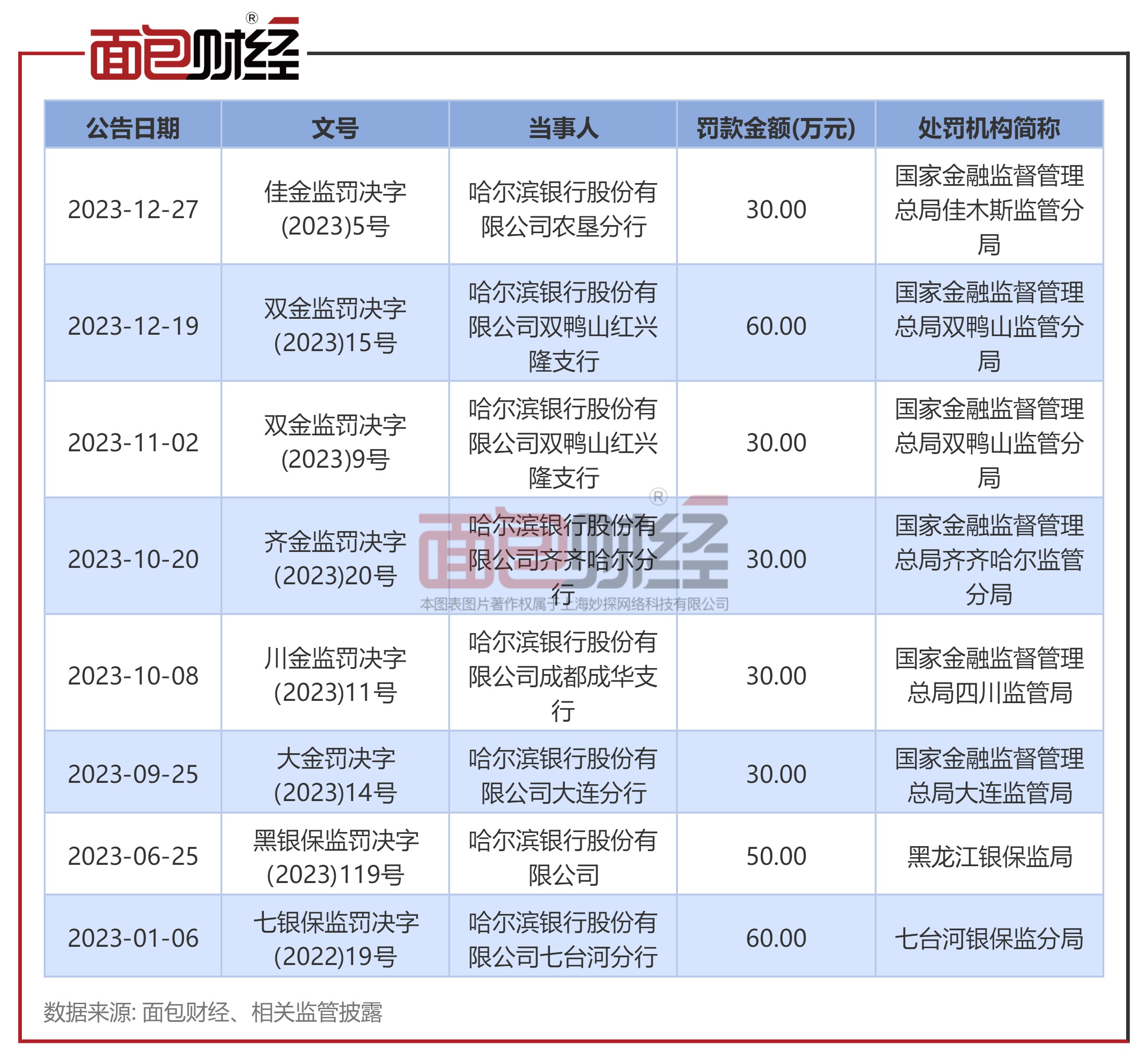 面包财经梳理发现,据不完全统计,今年以来哈尔滨银行股份有限公司及其分支机构多次被监管部门处罚,累计被罚没金额超300万元。