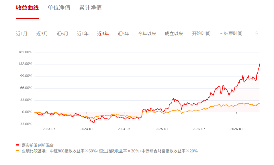 截至2026年4月22日,嘉实前沿创新混合年内净值上涨39.83%,跑赢业绩基准超过30个百分点。过去3年,基金净值上涨133.92%;成立以来年化收益率超过13%,同类排名118/1191。