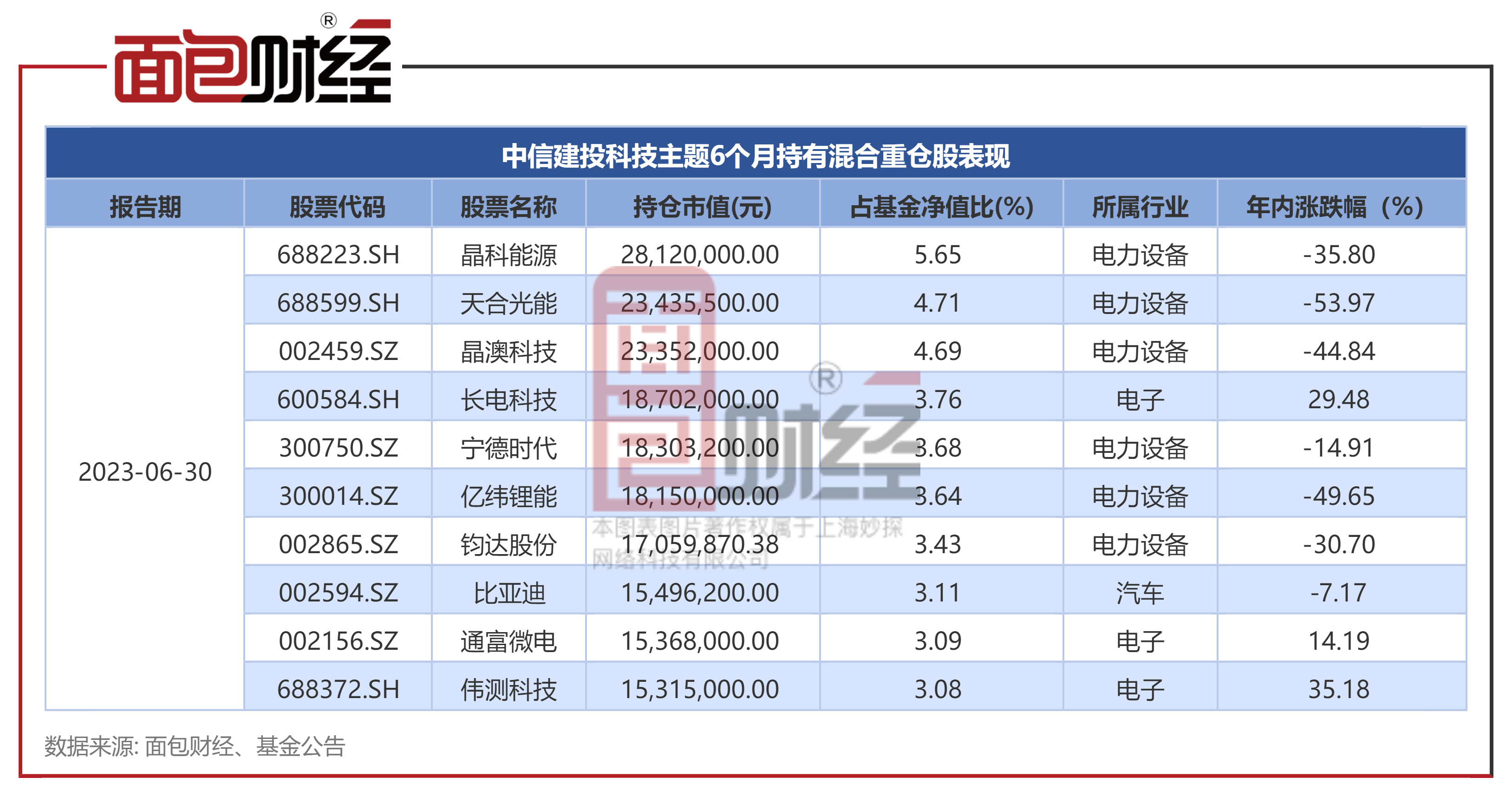 中信建投科技主题6个月持有混合重仓持有电力设备、电子等板块。2023年以来,该基金重仓的晶科能源、天合光能、晶澳科技等企业股价大幅下跌,拖累了基金的净值表现。