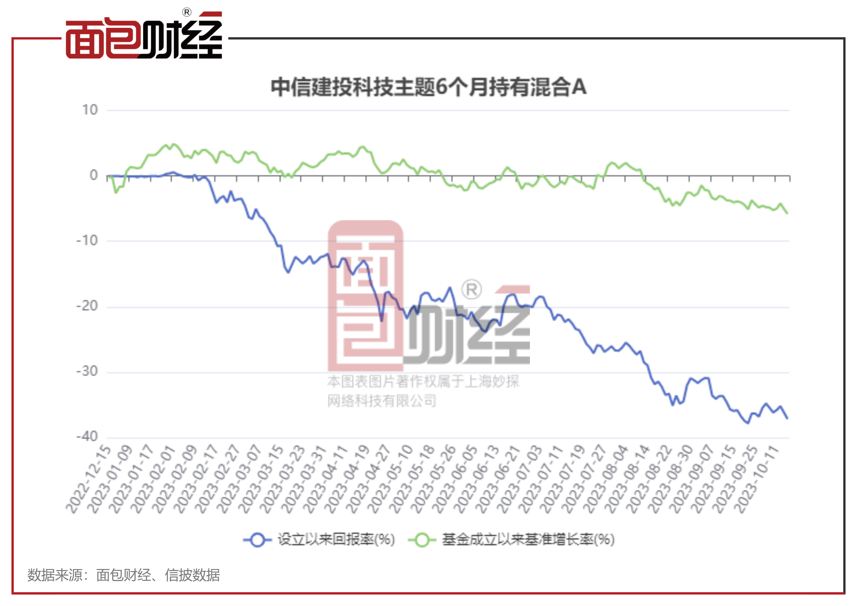 截至2023年10月16日(下同),中信建投科技主题6个月持有混合A成立约10个月累计亏损37.19%,跑输业绩比较基准逾30个百分点,同类排名3492/3504,表现垫底。