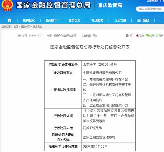 历史数据显示,1月5日,中国建设银行股份有限公司曾因并表管理内部审计存在不足、母行对境外机构案件管理不到位等四项违法违规事实被国家金融监督管理总局罚款170万元。
