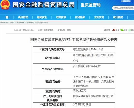 2024年3月6日,国家金融监督管理总局喀什监管分局公开披露了对中国建设银行股份有限公司喀什地区分行的行政处罚。