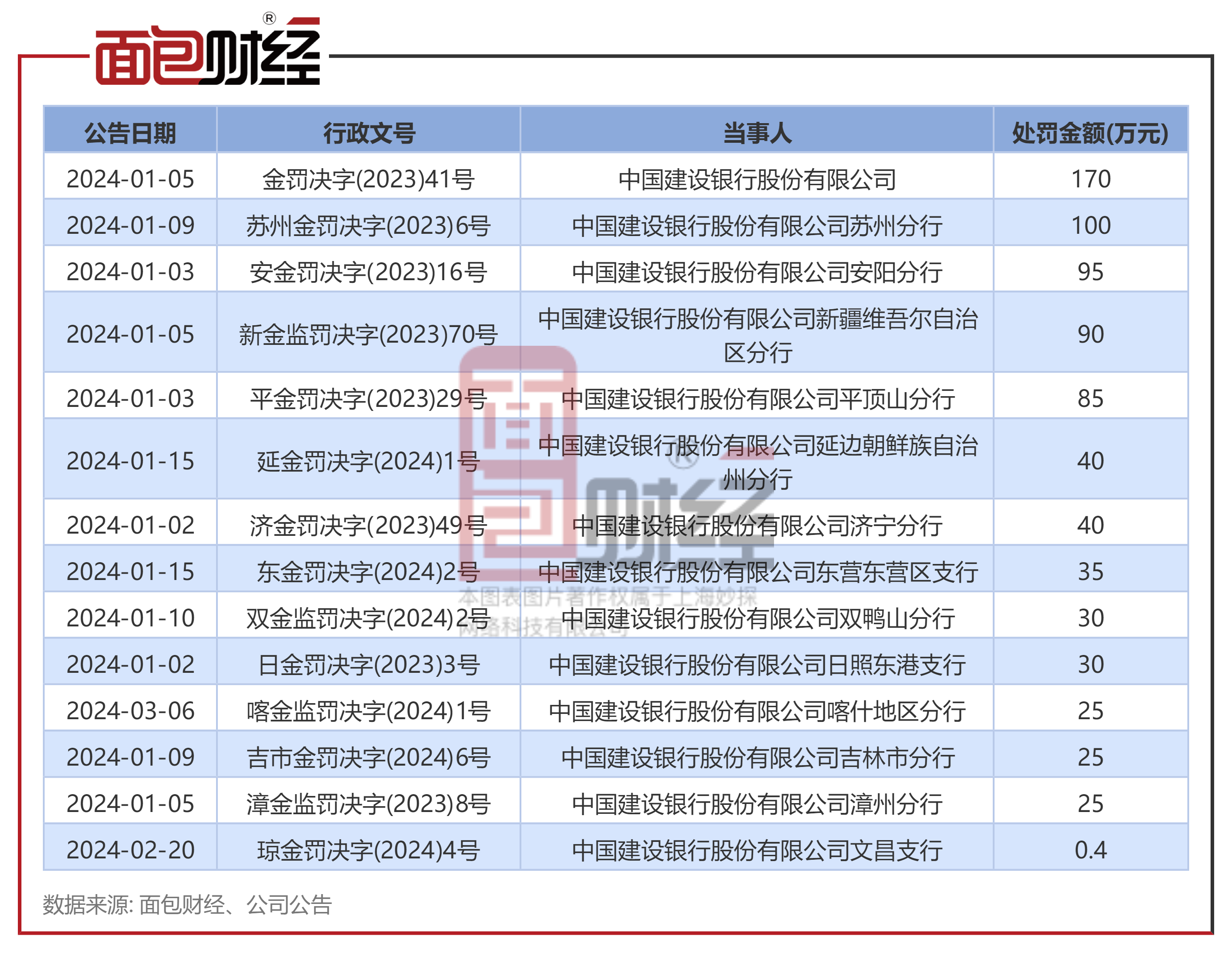面包财经梳理金融监管部门公开信息发现,2024年以来,建设银行累计收到14张罚单,累计被罚没金额为超过800万元,其中有两张罚单的被罚没金额高于100万元。