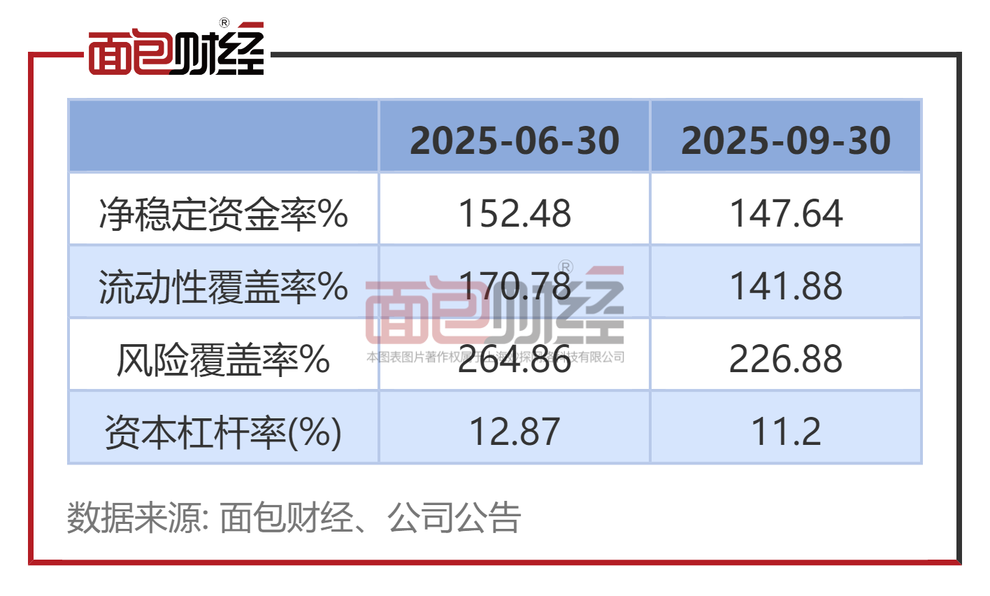 数据显示,2025年三季度,公司的风险覆盖率为226.88%,较2025年6月末下滑37.98个百分点;流动性覆盖率为141.88%,较2025年6月末下降28.9个百分点;净稳定资金率为147.64%,较2025年6月末下滑4.84个百分点;资本杠杆率为11.2%,较2025年6月末下滑1.67个百分点。