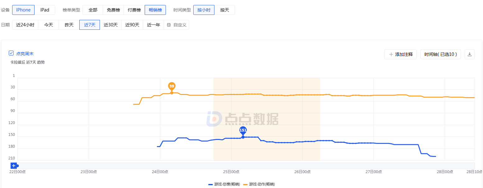从畅销表现来看,《卡拉彼丘》于10月24日最高位居iOS动作游戏畅销榜第39名;于10月25日最高位居iOS游戏畅销榜第151名。
