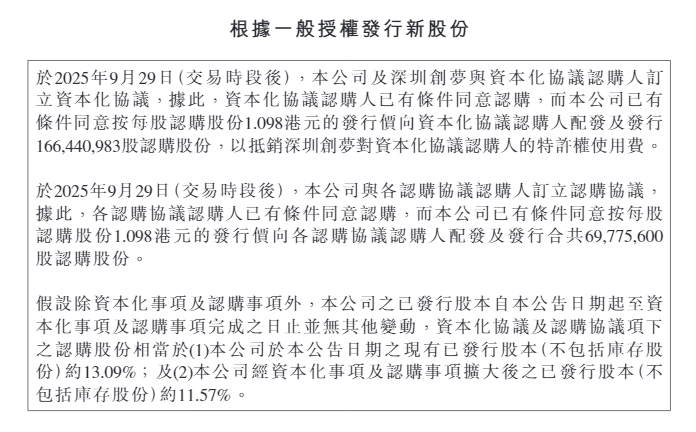 此外,于 2025 年 9 月 29 日,公司与各认购协议认购人订立认购协议,据此,各认购协议认购人已有条件同意认购,而公司已有条件同意按每股认购股份 1.098 港元的发行价向各认购协议认购人配发及发行合共 69,775,600 股认购股份。