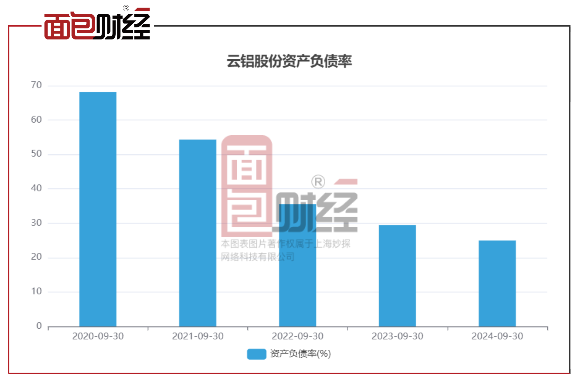 云铝股份资产负债率为24.99%,去年同期值为29.45%,同比减少4.46个百分点。