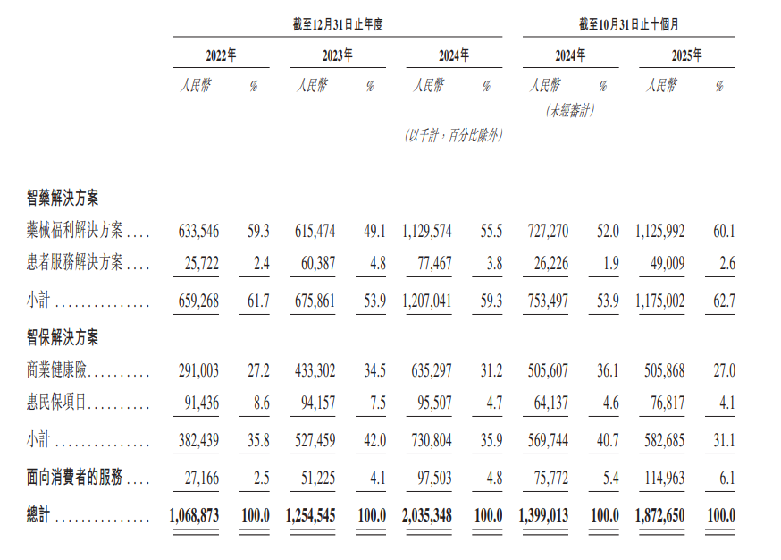 根据招股书披露,2025年1-10月,镁信健康62.7%的收入来自于智药解决方案、31.1%的收入来自于智保解决方案。