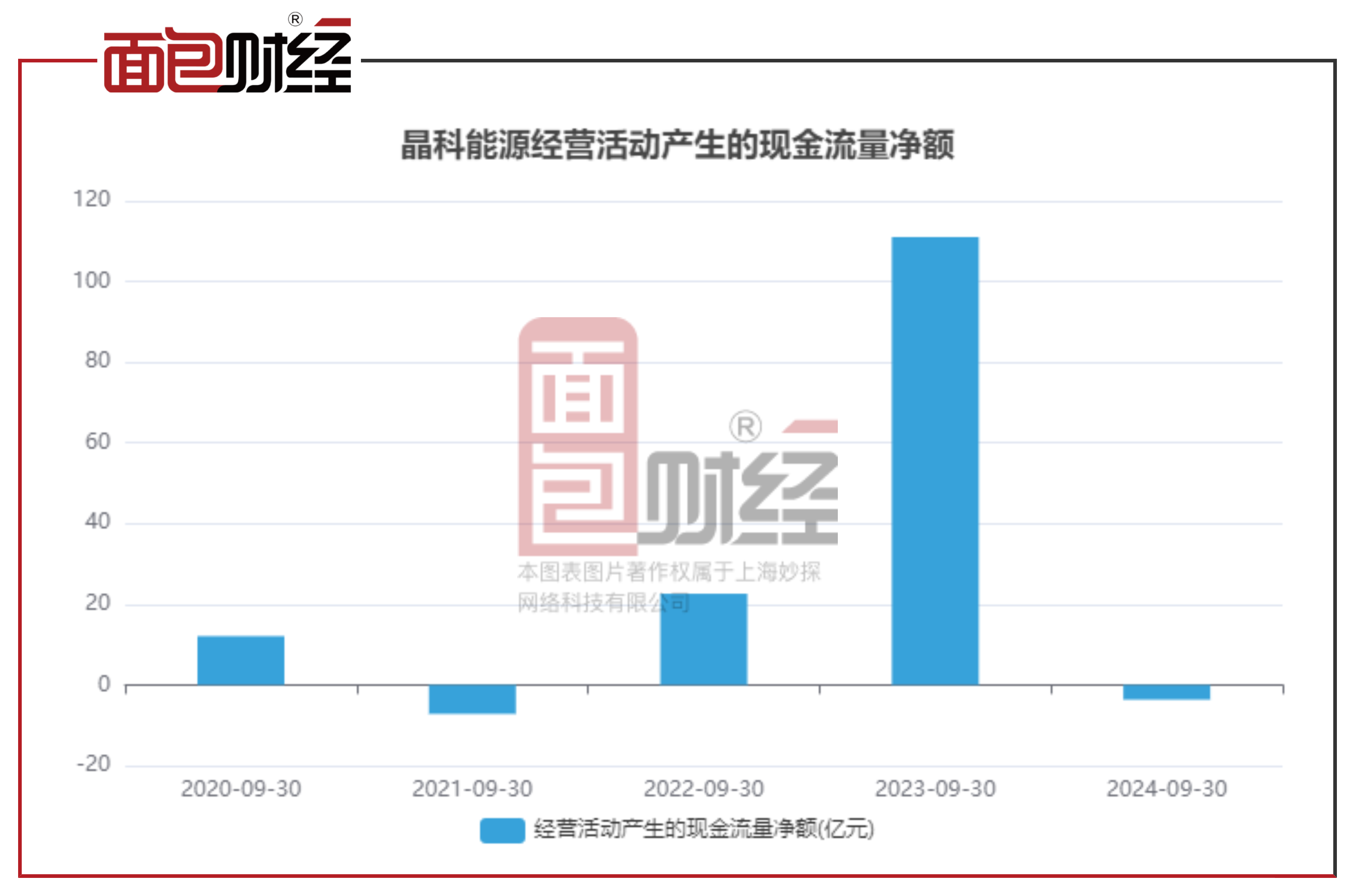 晶科能源第三季度经营性现金流净额为12.55亿元,同比下降77.32%。