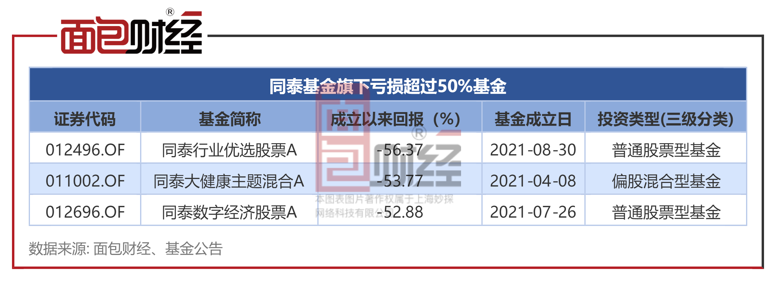 数据显示,截至2024年1月17日已披露数据,同泰基金旗下亏损超过50%的基金(初始基金口径,不包括指数基金,下同)主要有3只,包括同泰行业优选股票A、同泰大健康主题混合A、同泰数字经济股票A。