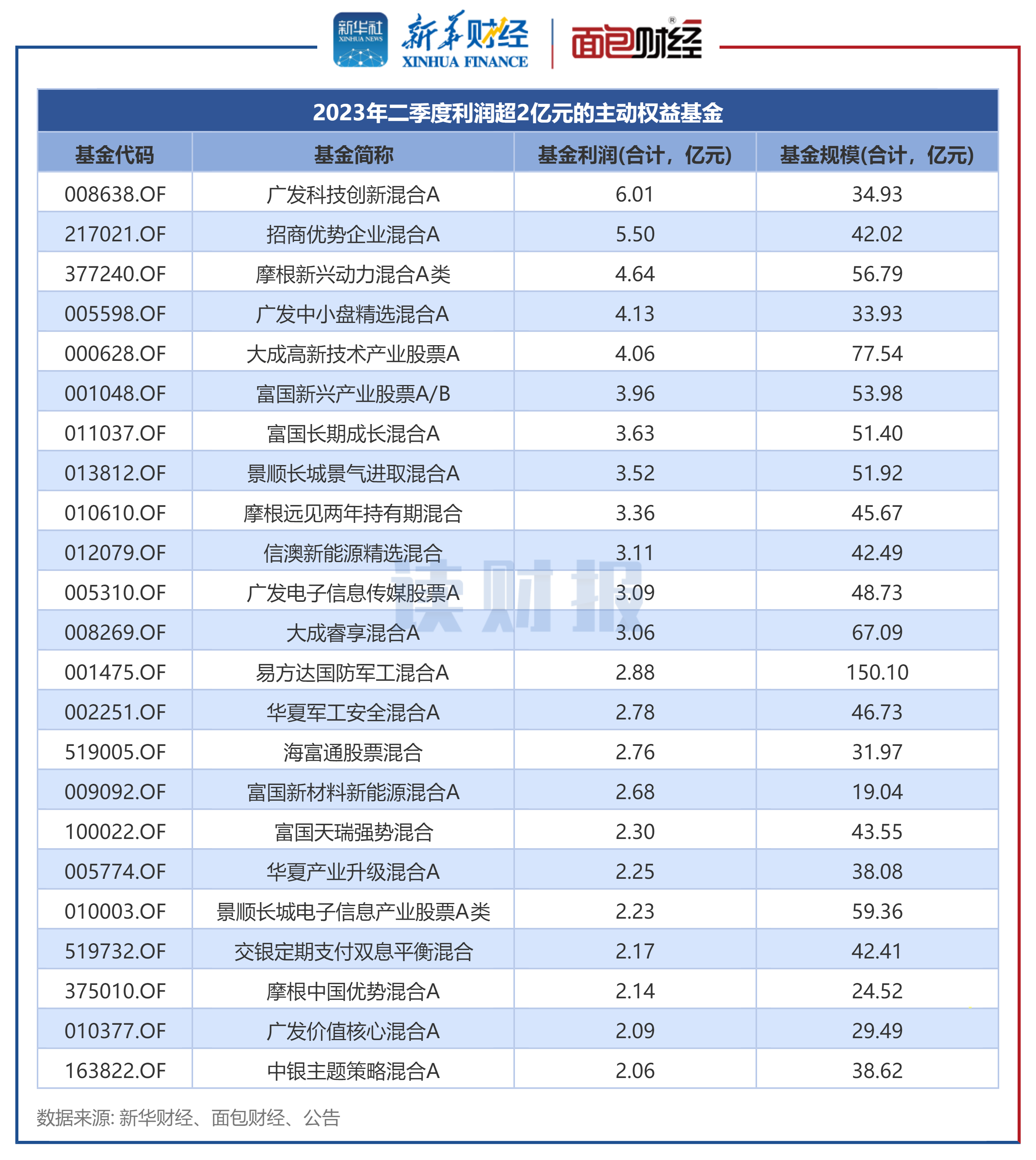 以基金二季度利润口径统计,20余只主动权益基金实现利润超过2亿元。广发科技创新混合、招商优势企业混合、摩根新兴动力混合的利润超过4.5亿元,百亿规模基金仅有易方达国防军工混合利润超2亿元。