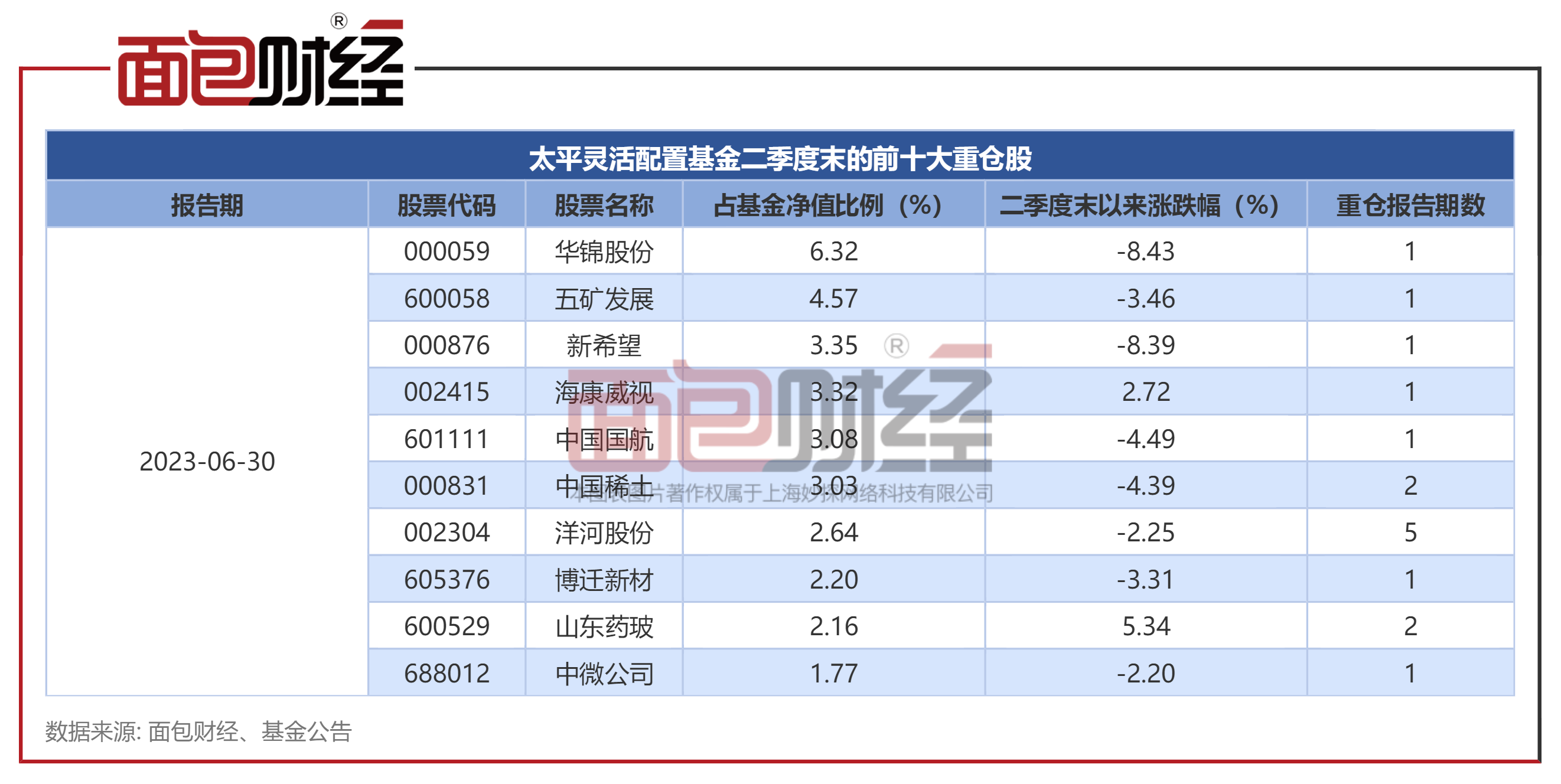 2023年中期报告显示,太平灵活配置基金的股票投资金额占基金总资产的比例为84.09%,前十大重仓股净值占基金净值的比例为32.43%,较一季度末比例提升逾17个百分点。