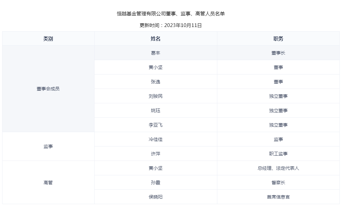 恒越基金的董事长为葛丰,总经理为黄小坚,督察长为孙霞。