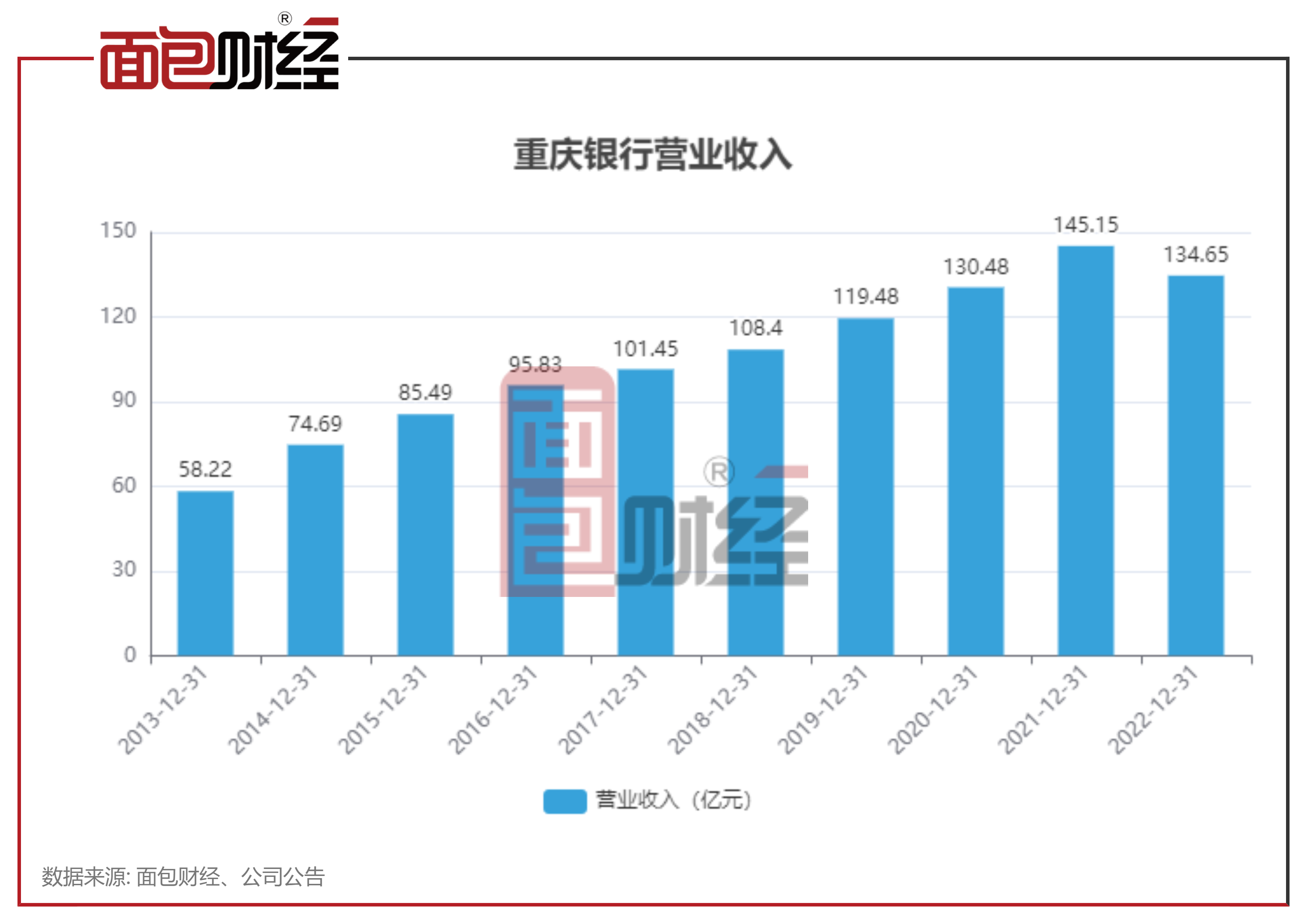 历史数据显示,2013年-2021年重庆银行的营收均保持增长,但2022年,该行的营收首次出现近十年以来的首次下滑。
