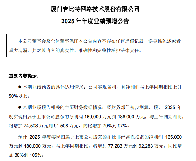 公告显示,吉比特预计2025年度实现归属于上市公司股东的净利润 169,000 万元到 186,000 万元,与上年同期相比,将增加 74,508 万元到 91,508 万元,同比增加79%到97%。