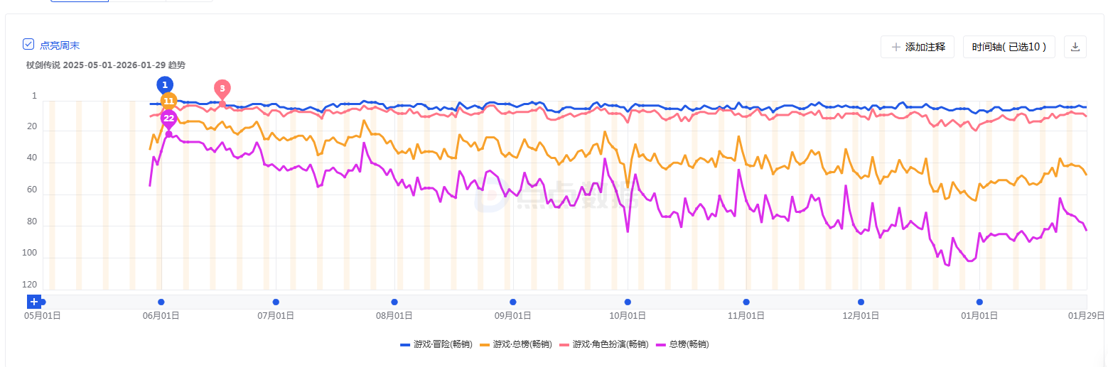 根据全球移动应用、游戏数据监测服务商点点数据的监测,《杖剑传说》上线以来在中国内地iOS游戏畅销榜的排名最高达到11名,此后波动下滑,近期畅销排名有所回升,目前保持在前50名。
