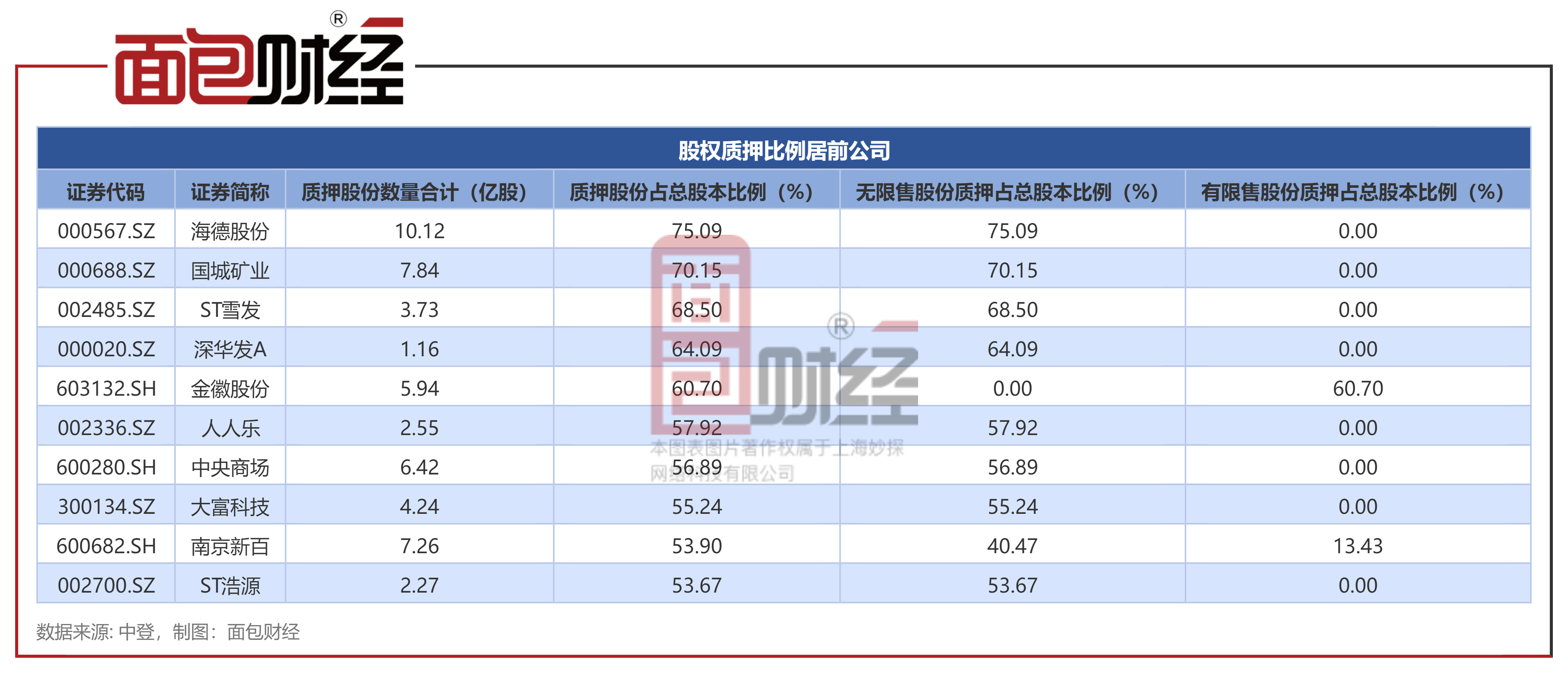 此外,深华发A、中央商场等12家公司质押股份占总股本比例均超过50%。