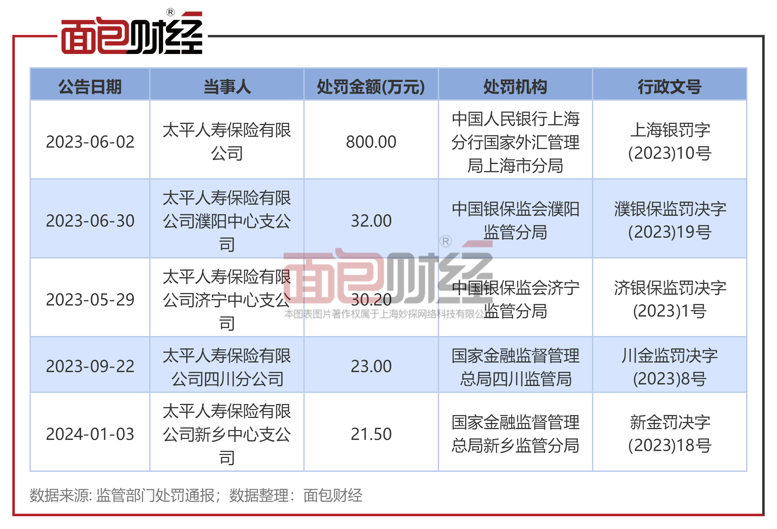 根据监管部门通报统计 ,近一年来,太平人寿及其分支机构多次被监管部门处罚。其中,涉及1张超800万元的大额罚单。以下为单张处罚金额20万元以上的罚单。