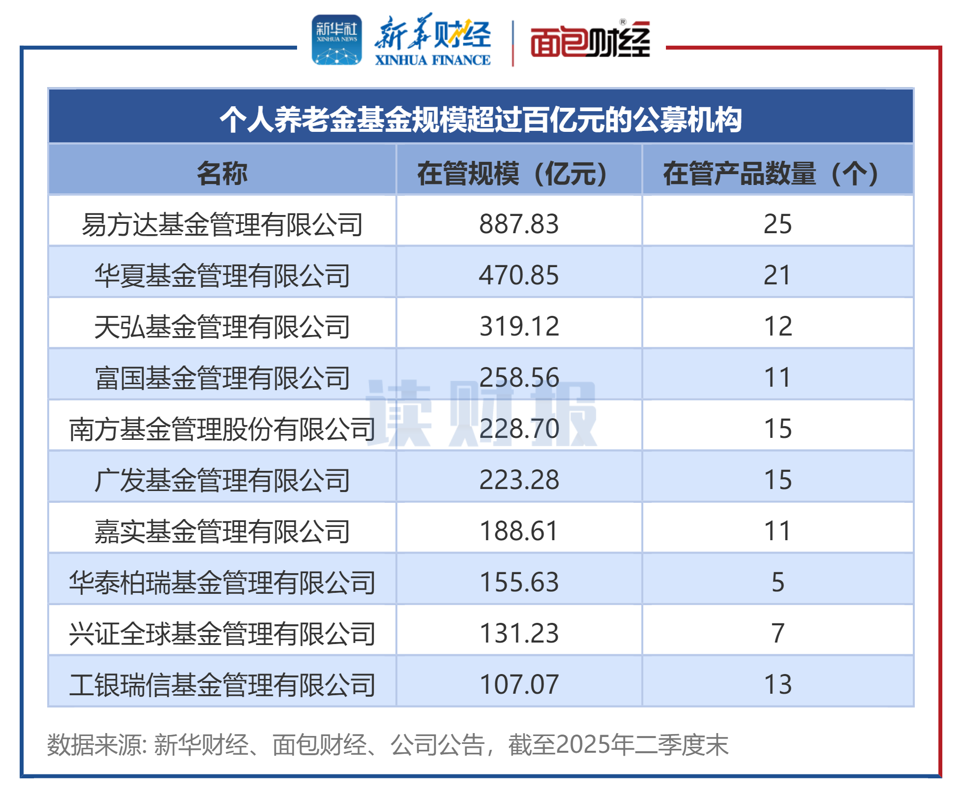 293只个人养老金基金涉及的基金管理机构共62家。截至2025年二季度末,易方达基金旗下共有25只个人养老金基金产品,管理规模达到887.83亿元,规模与数量均居首位。