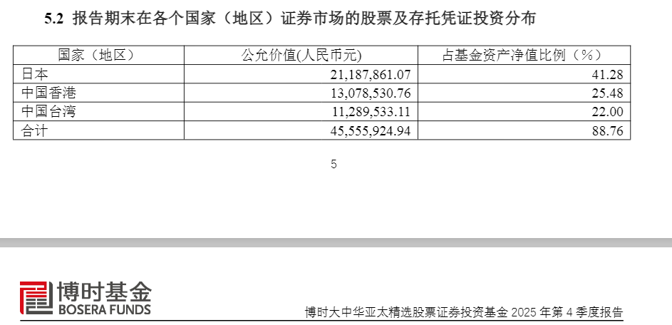 公开资料显示,2025年四季度末,博时大中华亚太精选股票(QDII)在日本、中国香港、中国台湾的股票及存托凭证投资公允价值占基金资产净值比例分别达到41.28%、25.48%、22%。