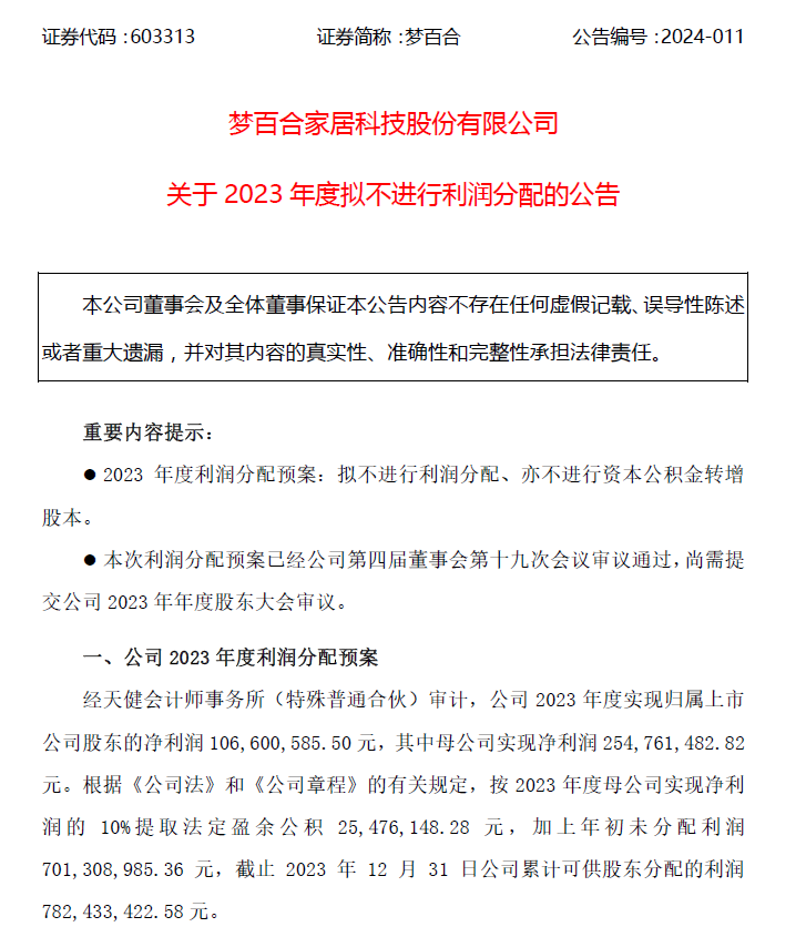 梦百合近日公告2023年度拟不进行利润分配。