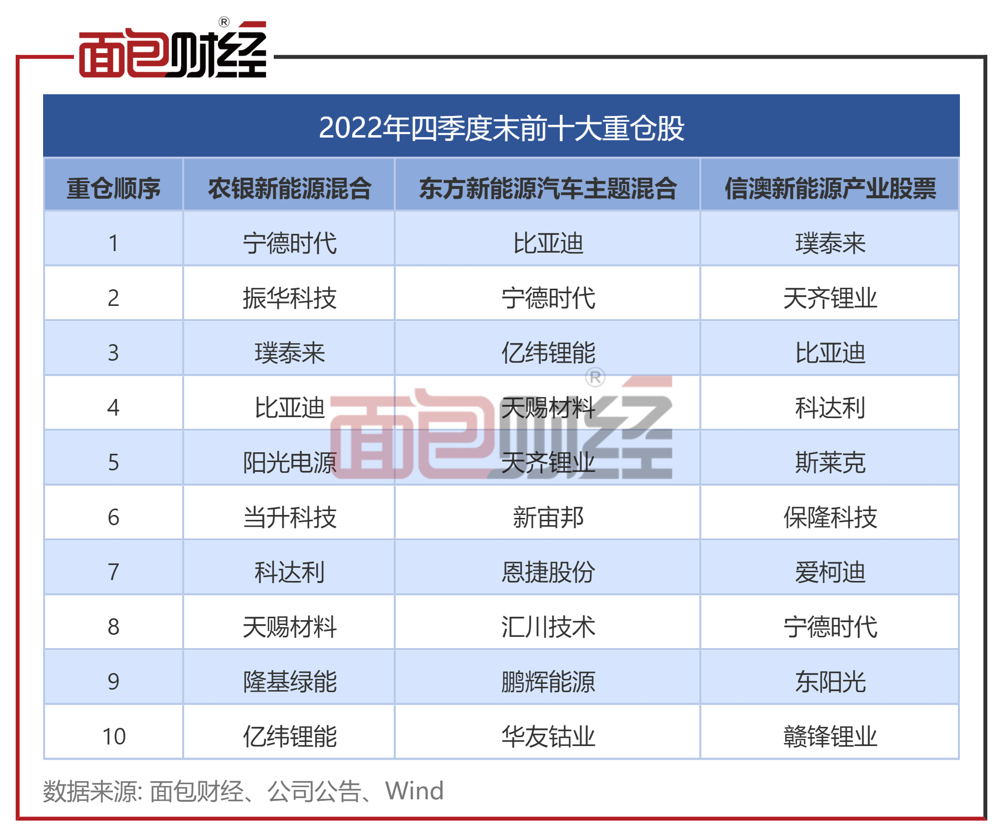 具体持仓方面,3只基金2022年四季度末的前十大重仓股中均包含宁德时代、比亚迪。此外,天齐锂业、天赐材料、亿纬锂能、璞泰来、科达利这些股票也均有2只基金重仓。