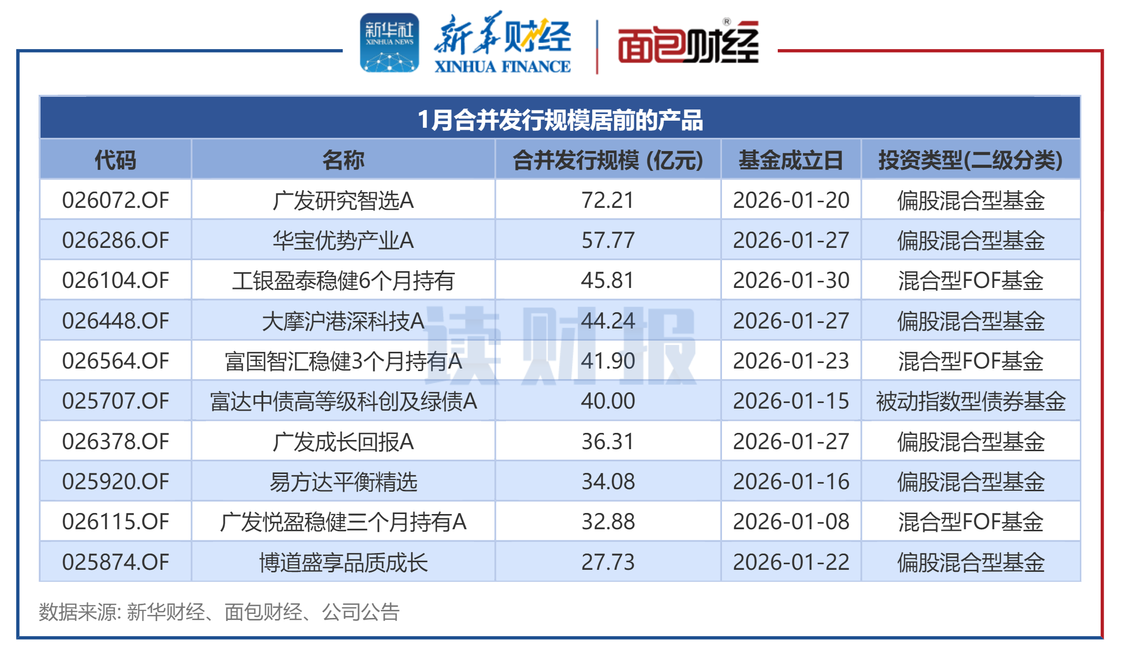 具体来看,1月合并发行规模最大的产品为广发研究智选。该基金于1月21日发布公告称,基金有效认购户数为78500户,基金合同于1月20日正式生效。该基金类型为偏股混合型基金,基金经理为杨冬,合并发行规模为72.21亿元。