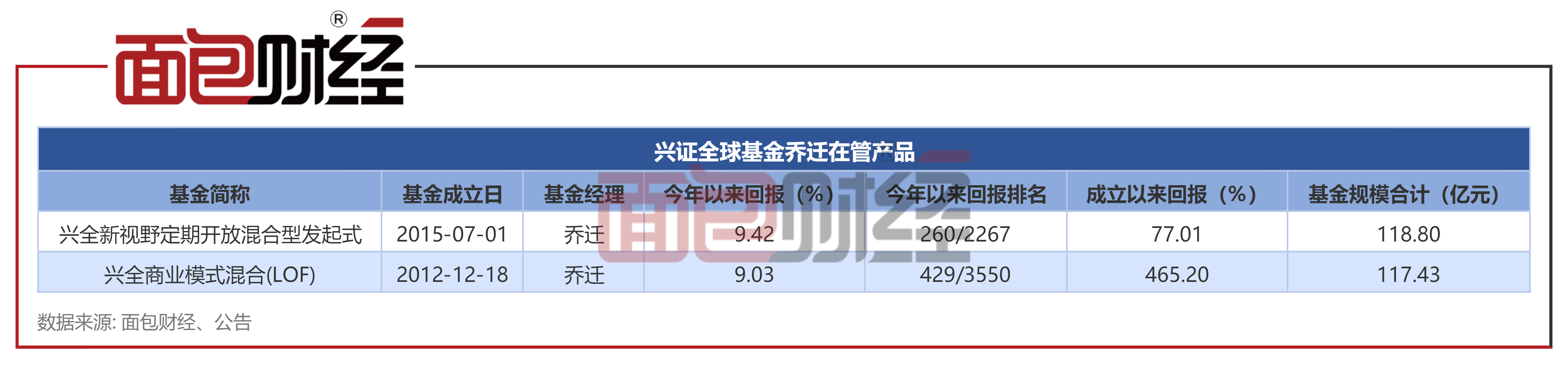 目前,乔迁主要管理兴全新视野定期开放混合型发起式、兴全商业模式混合(LOF)等2只产品,上述产品合计规模约236.23亿元。2只基金今年以来上涨均超过9%,表现较好。