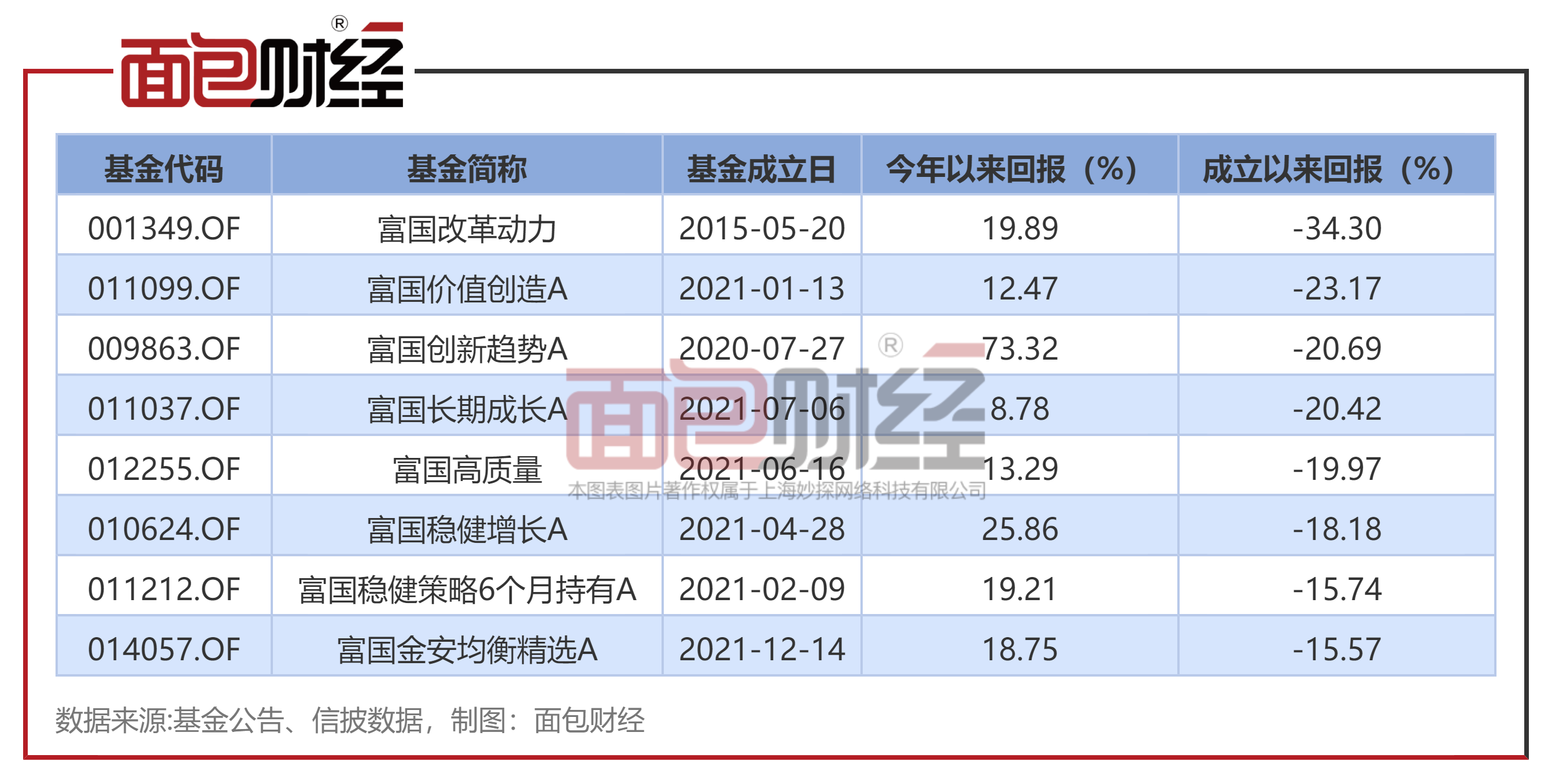 面包财经梳理公开资料显示,在今年业绩上涨的前提下,富国基金在管的8只产品成立以来净值仍下跌超过15%,使投资者利益深度受损。