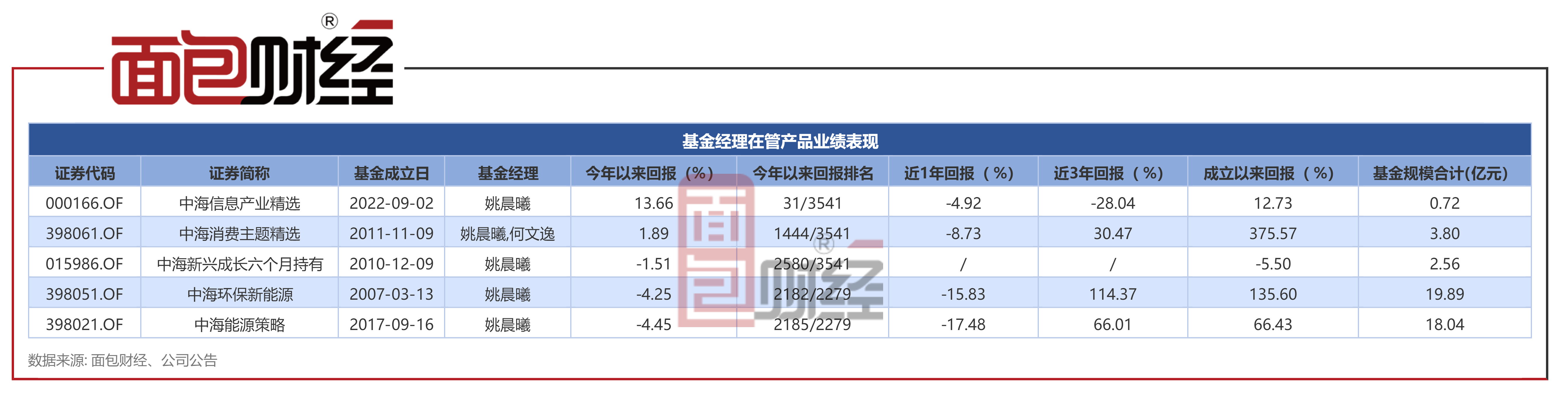 目前,姚晨曦主要管理中海能源策略、中海环保新能源、中海消费主题精选等5只产品(包括共同管理产品),上述产品合计规模约45亿元。