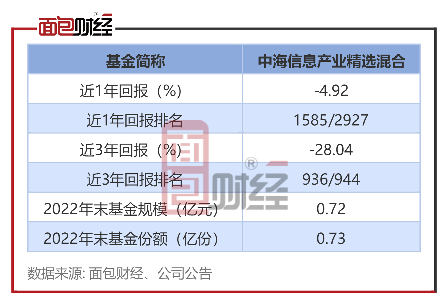 中海信息产业精选混合由中海安鑫保本转型而来。2022年四季度末,该基金的基金资产净值约为0.72亿元、基金份额总额约为0.73亿份。