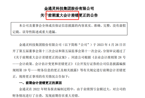 2023年4月,金通灵发布前期重大会计差错更正公告。公告显示,在2022年财务报表编制过程中,由于业绩预亏金额过大,公司发现前期存在重大差错并进行追溯调整。金通灵称,公司营业收入、建造合同的完工进度、预计负债等多项科目存在差错,而深交所也于2023年5月下发问询函,要求公司说明各项调整的具体情况等。
