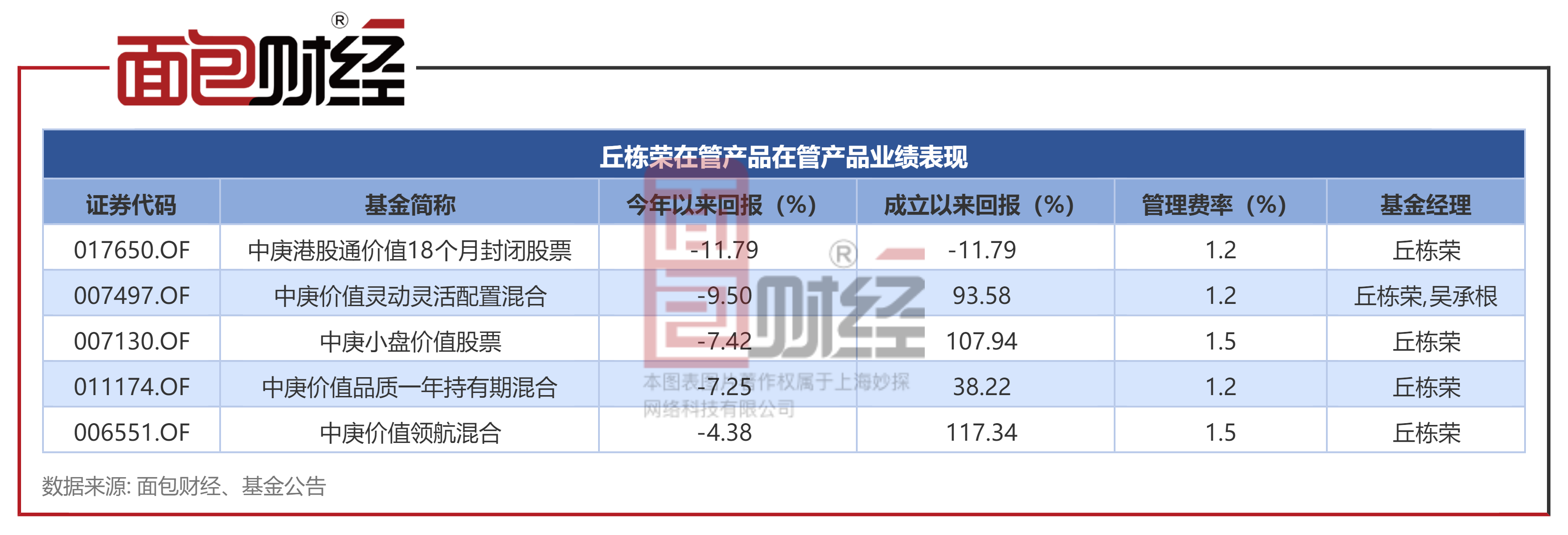丘栋荣持有中庚基金9.73%股份,在管产品年内收益均告负